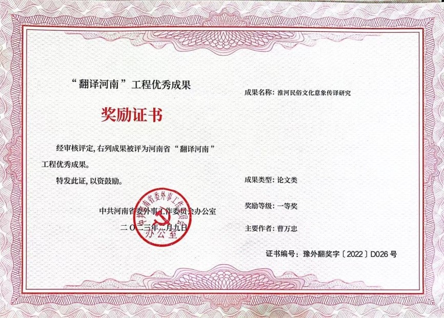 近日,中共河南省委外事工作委员会通报了2022年度“翻译河南”工程优秀成果征集情况,我院曹万忠老师的论文《淮河民俗文化意象传译研究》获得一等奖,2021级翻译硕士何琼的《翻译目的论指导下建筑物名称的翻译--以周口市关帝庙建筑为例》获得二等奖、2021级翻译硕士邹伟伟的《传播学视域下的河南作家小说海外译介与传播--以邵丽《黄河故事》英译为例》获得三等奖。
