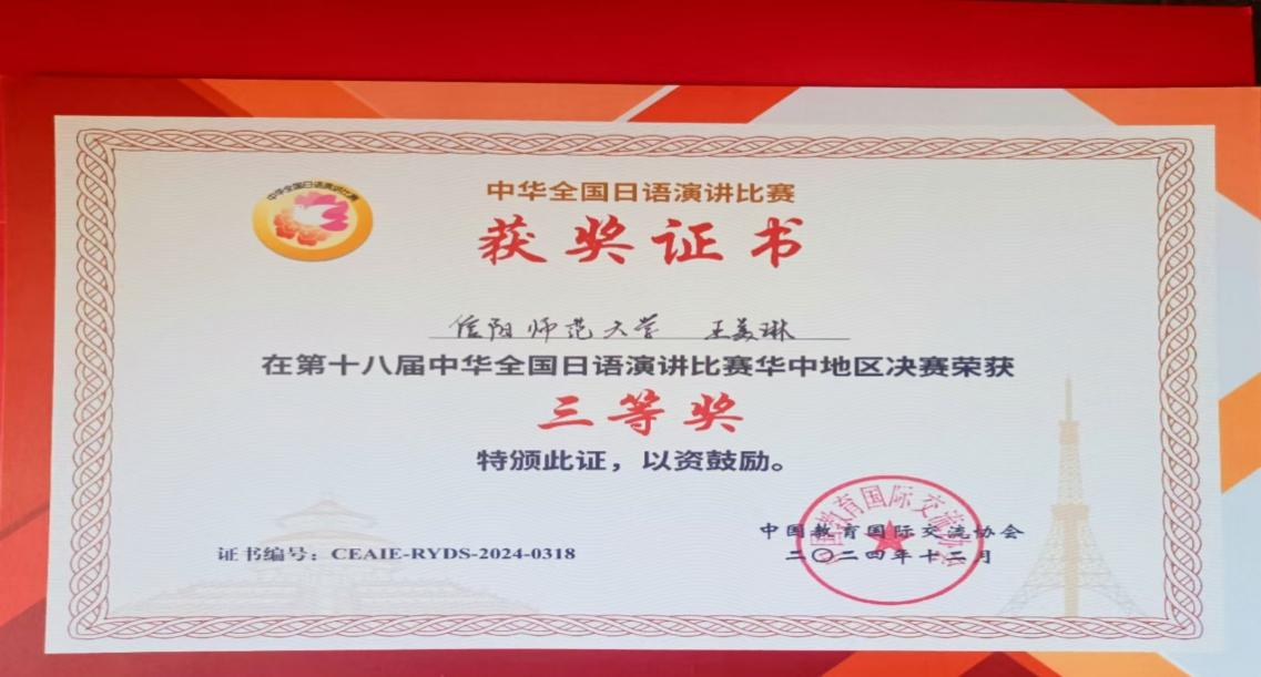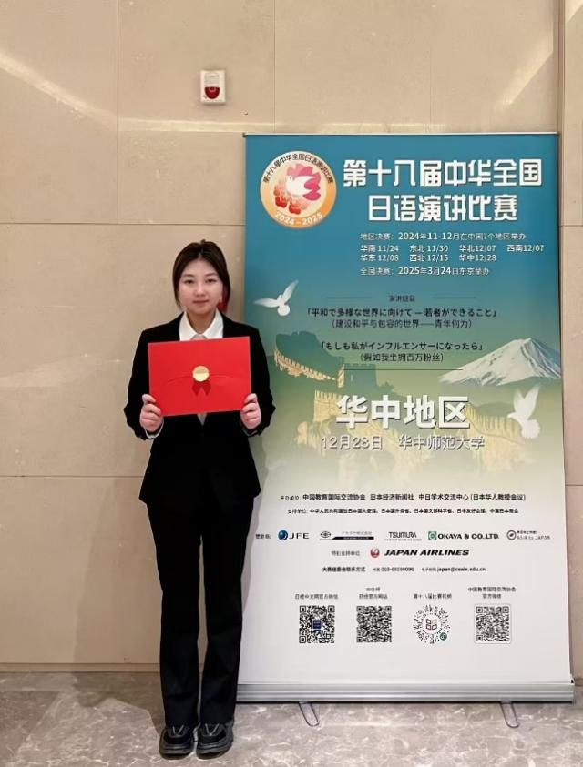 近日,第十八届中华全国日语演讲比赛华中赛区决赛在华中师范大学隆重落下帷幕,我校日语专业2022级王美琳同学在李静老师和田口晴近老师的指导下荣获华中赛区决赛三等奖。