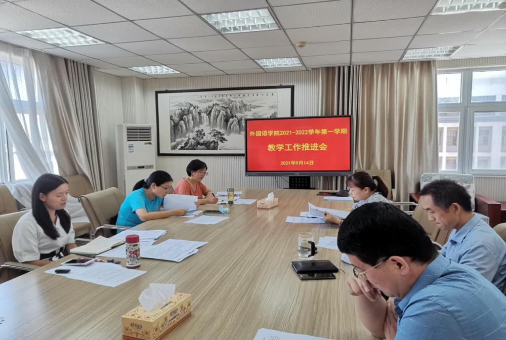9月14日下午,新葡的京集团8814在人文楼五楼会议室召开了2021-2022学年第一学期教学工作推进会。英语系主任余运伟、日语系主任张鸿鹏、翻译系副主任曹万忠、商务英语系主任吴倩、第二外语教研室主任傅翀及教务办工作人员共同参加了会议。会议由副院长郭敏主持。
