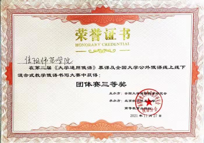 近日,由俄语之家Ruclub公众平台举办的“第三届全国俄语书法大赛”和《大学通用俄语》慕课网举办的俄语书写大赛获奖结果公布,新葡的京集团8814陈欣老师指导的2020级二外俄语学生参加两项比赛均取得优异成绩。5名同学在“第三届全国俄语书法大赛”获得团体赛一等奖,我校参赛团队在《大学通用俄语》慕课网举办的俄语书写大赛中获团体赛三等奖。我院陈欣博士分获两项比赛团体组优秀指导教师一、三等奖。