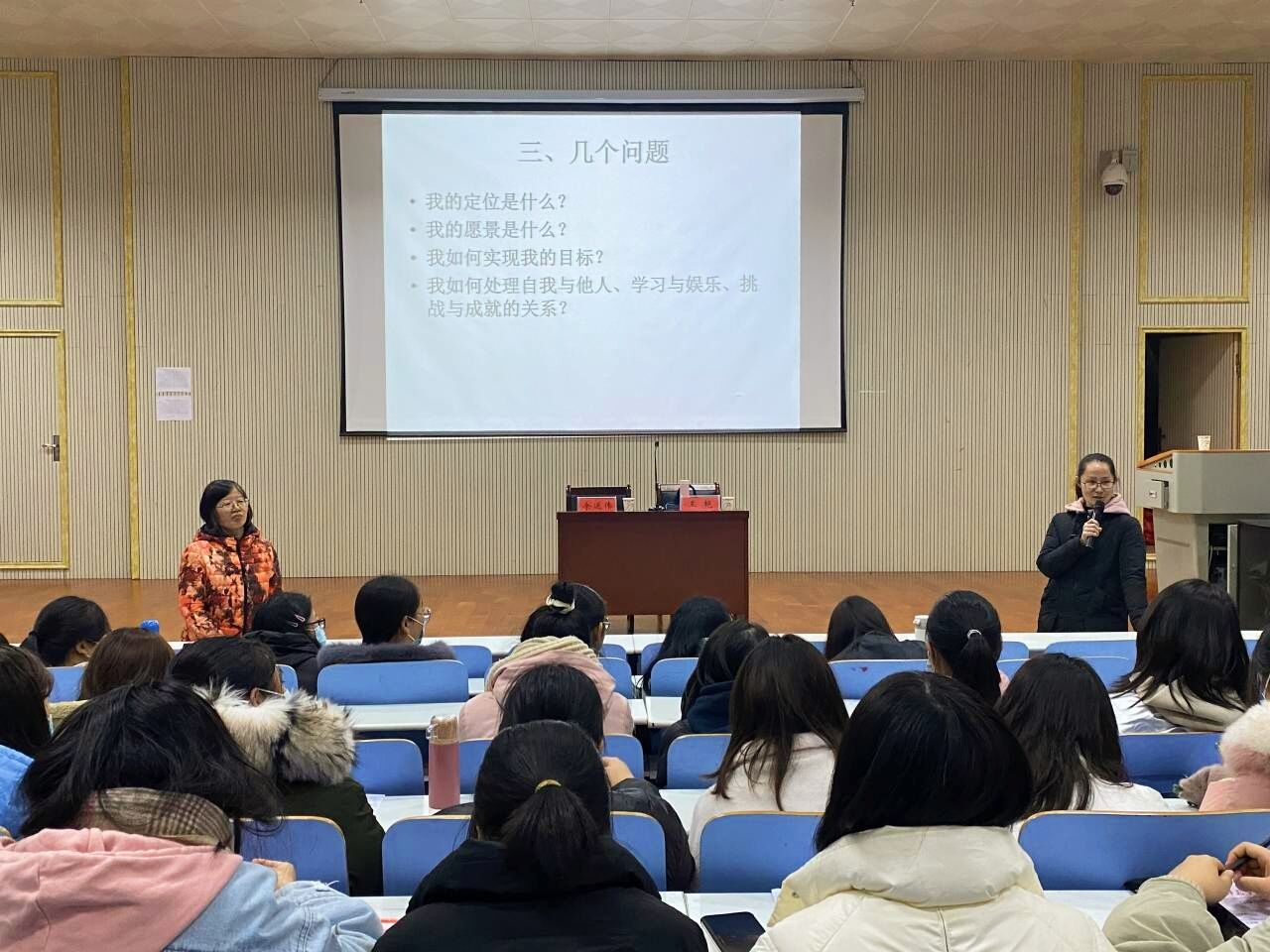 余运伟从专业学习、课程结构、学分构成、第二外语学习等方面介绍了英语专业人才培养情况,结合专业培养方案,为同学们提出专业学习建议,并就英语专业等级考试的注意事项作了说明。王艳分析了专业就业、考研形势,希望同学们尽早确立目标,充分利用时间,提高学习效率,做好学习规划。交流问答环节,同学们就学习中遇到的问题和困惑向老师们请教,两位老师分别作了耐心、细致的解答,同学们纷纷表示受益匪浅。