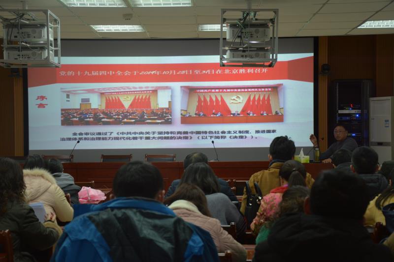 程晋富教授以严谨缜密的逻辑思维、高屋建瓴的理论架构,结合生动活泼的典型案例对十九届四中全会召开的重大意义,中国特色社会主义制度和国家治理体系的显著优势,坚持和完善中国特色社会主义制度、推进国家治理体系和治理能力现代化的总体要求、总体目标和重点任务以及如何确保全会确定的各项目标任务全面落实到位进行了系统、深入、细致的解读。报告史料丰富、语言生动、求证有据,进一步加深了全体教职员工对全会精神的理解和把握,有力地激励了全院教职员工深入学习贯彻全会精神,增强“四个意识”,坚定“四个自信”,做到“两个维护”,自觉尊崇制度、严格执行制度、坚决维护制度,把全会确定的各项目标任务与学院具体工作实际相结合,以更加务实的作风、更加奋发有为的精神状态,为持续推进我校各项事业的发展凝心聚力,为建设高水平师范大学的目标而不懈奋斗。