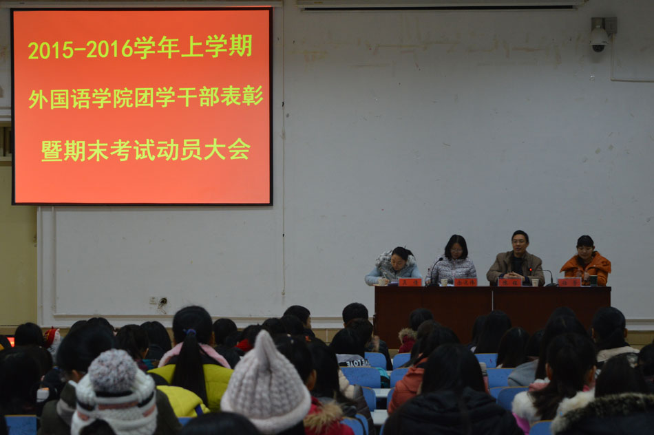 为严肃考风考纪,推动期末考试各项工作顺利开展,1月5日上午,我院2015-2016学年上学期团学干部表彰暨期末考试动员大会在人文楼报告厅举行。我院党委副书记陈铭,教务办主任余运伟,团总支书记任芳,专职辅导员吴倩、张鹏等老师与全体学生干部共同参加此次会议。大会由陈铭主持。