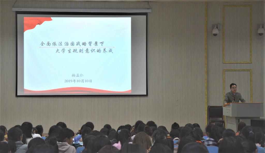 报告以“全面依法治国战略背景下大学生规则意识的养成”为题,从具体案例切入,阐述了全面依法治国战略的时代背景及历史背景,释明了全面依法治国战略的新理念和新内涵,分析了规则在规范权力运行、促进社会和谐稳定、保障公民权利等方面的重要性。柏孟仁指出,当代大学生应培养良好的规则意识。他通过列举和分析若干经典案例,对国家法律法规、学校规章制度和学院管理规定等相关内容进行了分析解读,告诫同学们要遵守法律法规,严守校规校纪。他希望同学们在遵守规则的基础上牢记青年人的使命,坚守初心,砥砺前行,为实现中华民族伟大复兴的中国梦共同奋进。