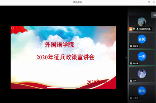 为了深入学习贯彻习近平新时代中国特色社会主义强军思想,宣传2020年国家征兵政策,加强同学们为国家服务的意识,新葡的京集团88145月29日晚7点通过腾讯会议开展征兵政策宣讲会,参会人员实现各年级各班级全覆盖,为大学生进行了及时的应征入伍政策和国防知识宣讲普及,会议由武装干事孙桢桢主持。
