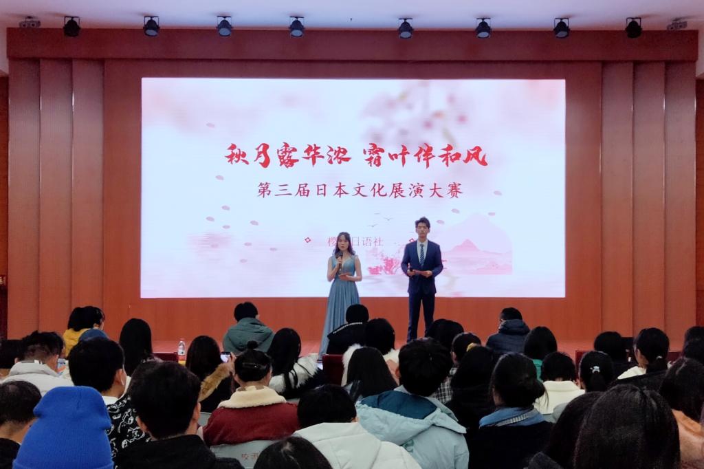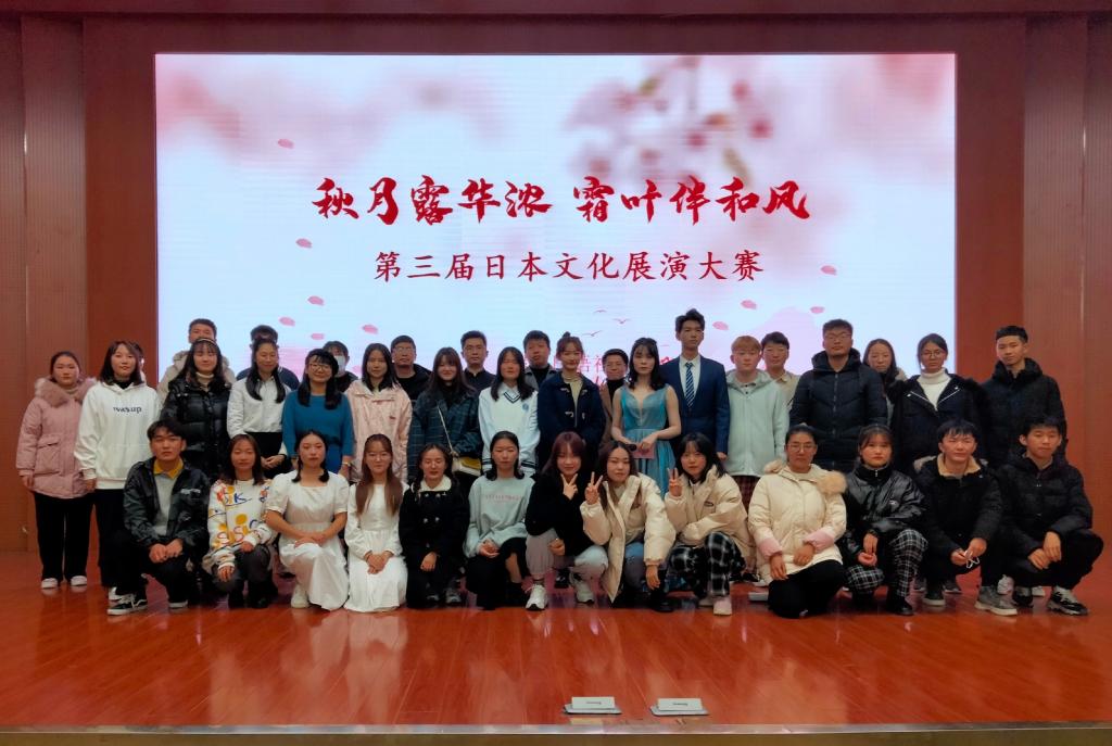 11月28日晚,我院在逸夫楼报告厅举办第三届日本文化展演大赛。日语专业外教田口晴近,日语专业任课教师张鸿鹏博士、晏少杰老师、李静博士及我院团委书记孔宪巍应邀出席并担任评委。