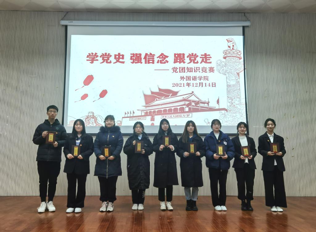 竞赛活动分为笔试和现场答题两个环节。笔试环节于12月10日在2021级各班固定教室举行,我院2021级全体学生参与考试,成绩优异,展现了我院学生对党团知识学习、理解、把握和运用的优异水平。现场答题于12月14日在人文楼报告厅举行,分为“神采飞扬”支部风采展、“按部就班”必答题、“争分夺秒”抢答题三个环节。经过激烈角逐,最终2021级翻译二班荣获一等奖,2021级英语三班、英语二班、日语二班荣获二等奖,2021级英语四班、翻译一班、日语一班、英语一班、英语五班荣获三等奖。