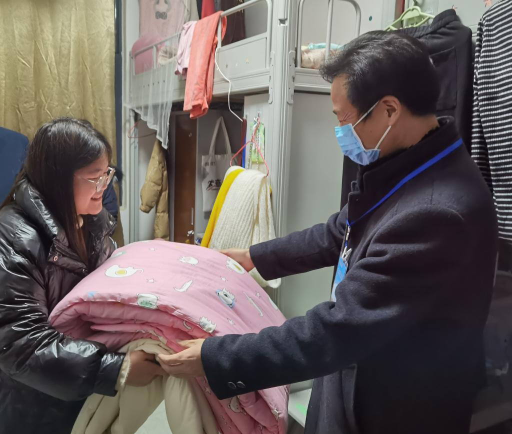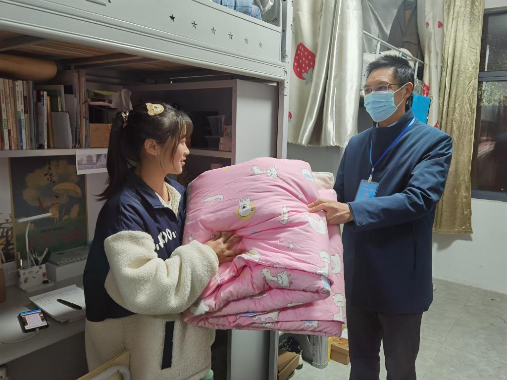 走访过程中,陈铭一行与同学们亲切交谈,深入了解他们的学习、生活情况,提醒学生注意防寒保暖,并亲手将爱心棉被送到贫困生手中。陈铭认真听取了学生生活和学习中遇到的问题、困难,勉励学生勇于弘毅与坚持、乐于感恩和奉献、敢于负责有担当,以才智振兴民族、以爱心回报社会,做一名合格的新时代有志青年。蔡满园叮嘱学生们及时添衣加被,注意冬季用电安全,以健康的体魄投入到接下来的学习任务中,鼓励大家勤于思考,练就本领,全面提升自身的综合素质。同学们深受感动,纷纷表示一定会刻苦学习,以实际行动回报学校和社会。