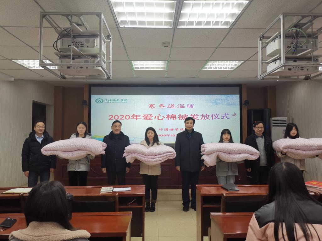 暖暖冬日情,融融学子心。12月1日下午,我院在人文楼六楼会议室举行2020年“寒冬送温暖”爱心棉被发放仪式,我院党委书记周学红,院长蔡满园,党委副书记柏孟仁,副院长姚光金,专职辅导员陈龙、周旋、孙桢桢出席仪式,仪式由柏孟仁主持。
