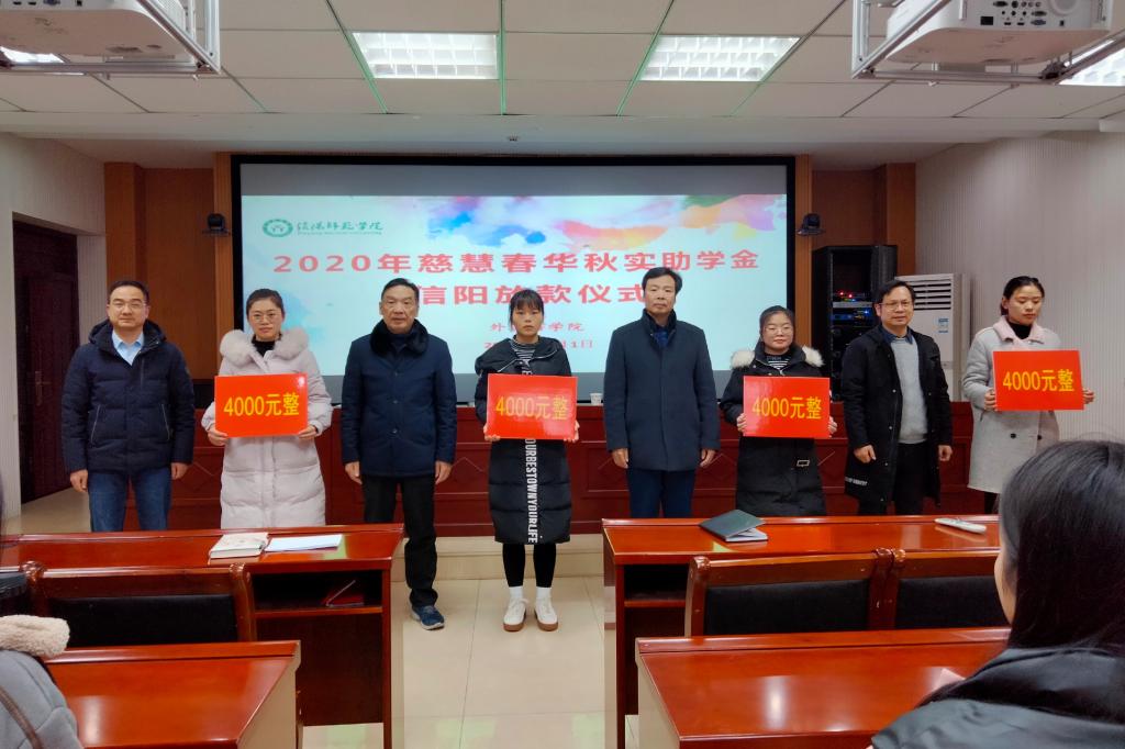 12月1日下午,2020年慈慧春华秋实助学金放款仪式在人文楼六楼会议室隆重举行。新葡的京集团8814党委书记周学红,院长蔡满园,党委副书记柏孟仁,副院长姚光金出席仪式,辅导员陈龙、周旋、孙桢桢以及全体受资助学生共同参加仪式,仪式由柏孟仁主持。
