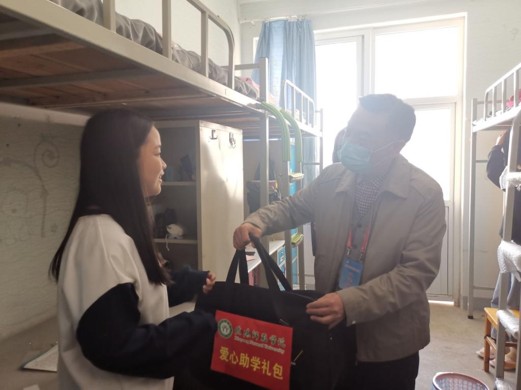 9日下午,我院党委书记周学红,副院长朱丽,党委副书记柏孟仁与我院全体辅导员及新生班主任走访新生宿舍,与同学们亲切交谈,并代表学校为建档立卡学生送上“爱心助学礼包”和“防疫礼包”。周学红亲切询问了同学们的开学近况,希望新生们尽快适应新的环境,注重疫情防控,养成良好的生活和学习习惯,建立和谐友好的人际关系,并提醒同学们一定要增强安全意识,提高防范能力,注意防范校园网贷、电信诈骗、非法传销等安全风险,确保人身财产安全。