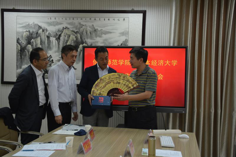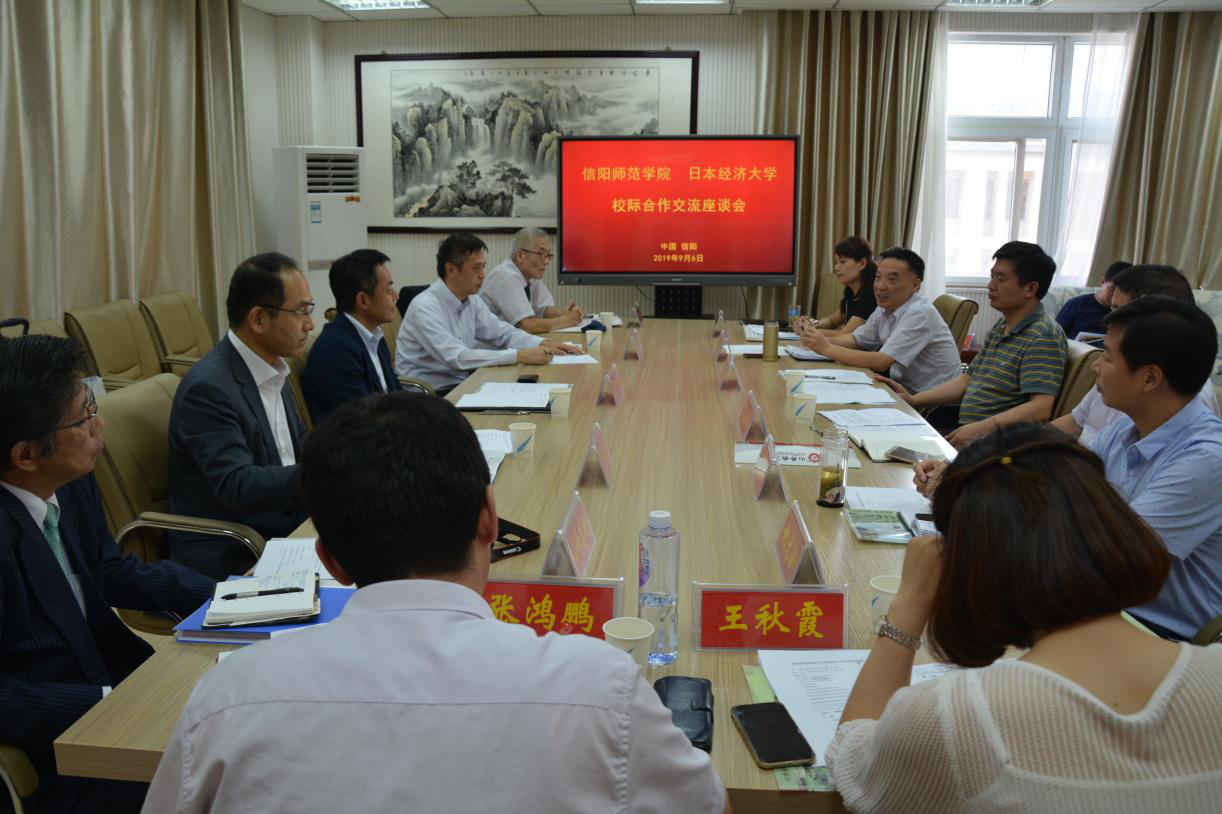 会议伊始,与会人员一同观看了信阳师范学院宣传片。余本海致欢迎辞,他代表学校对古贺郁人一行的到来表示热烈欢迎,简要介绍了我校的发展历史、学科建设、学生国际交流等情况。古贺郁人高度赞扬了我校浓厚的学习氛围,介绍了日本经济大学的办学规模、历史沿革和办学特色。随后,双方围绕签订合作交流协议、交换留学生及双学位项目、科学研究等方面进行磋商。周学红总结讲话,他对日本经济大学的办学理念表示认同,希望双方尽快落实达成的共识,推动校际合作与交流向更高层次迈进。