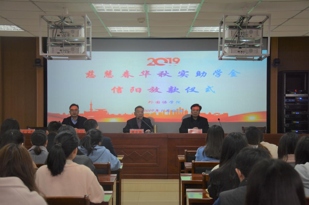 11月23日上午,2019年上海慈慧公益基金会春华秋实助学金放款仪式在人文楼六楼会议室隆重举行。新葡的京集团8814党委书记周学红,院长蔡满园,党委副书记柏孟仁出席仪式,辅导员陈龙、周旋、孔宪巍、孙桢桢以及全体受资助学生共同参加仪式。仪式由柏孟仁主持。