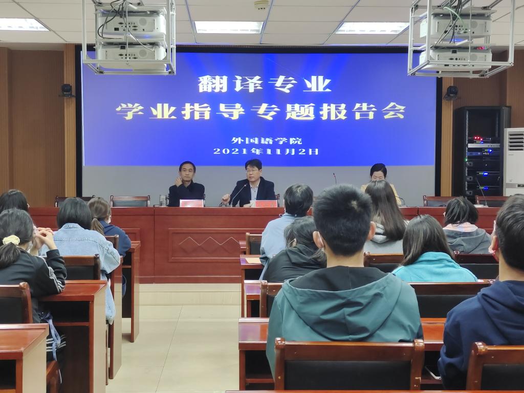 11月2日晚,我院在人文楼6-07会议室举办翻译专业学业指导专题报告会。报告会由翻译专业任课教师宣军磊博士、崔淑丽博士、曹万忠副教授共同讲授,我院2021级翻译专业全体学生聆听了报告。