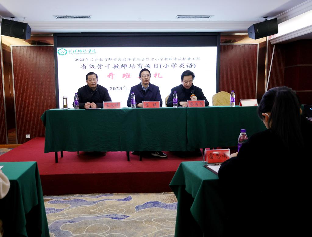 2月27日上午,2022年义务教育师资薄弱环节改善暨中小学教师素质提升工程升级骨干教师培育项目(初中/小学英语)开班典礼在维也纳国际酒店五楼贝多芬厅举行。新葡的京集团8814党委书记陈铭,院长蔡满园,副院长余永锋,小学英语班班主任宋冬梅、曹慧琳,初中英语班班主任雷思雨、黄艳文出席典礼,来自驻马店、济源、漯河、信阳、南阳等五个地区市基础教育一线的118名学员参加典礼。开班典礼由余永锋主持。