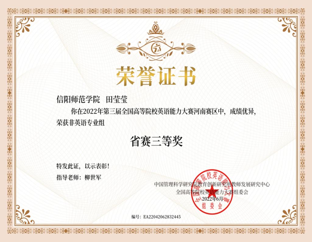 三、2022年第三届全国高等院校英语能力大赛定于2022年5月28日至5月29日举行,公共外语教研室老师指导学生获奖证书如下: