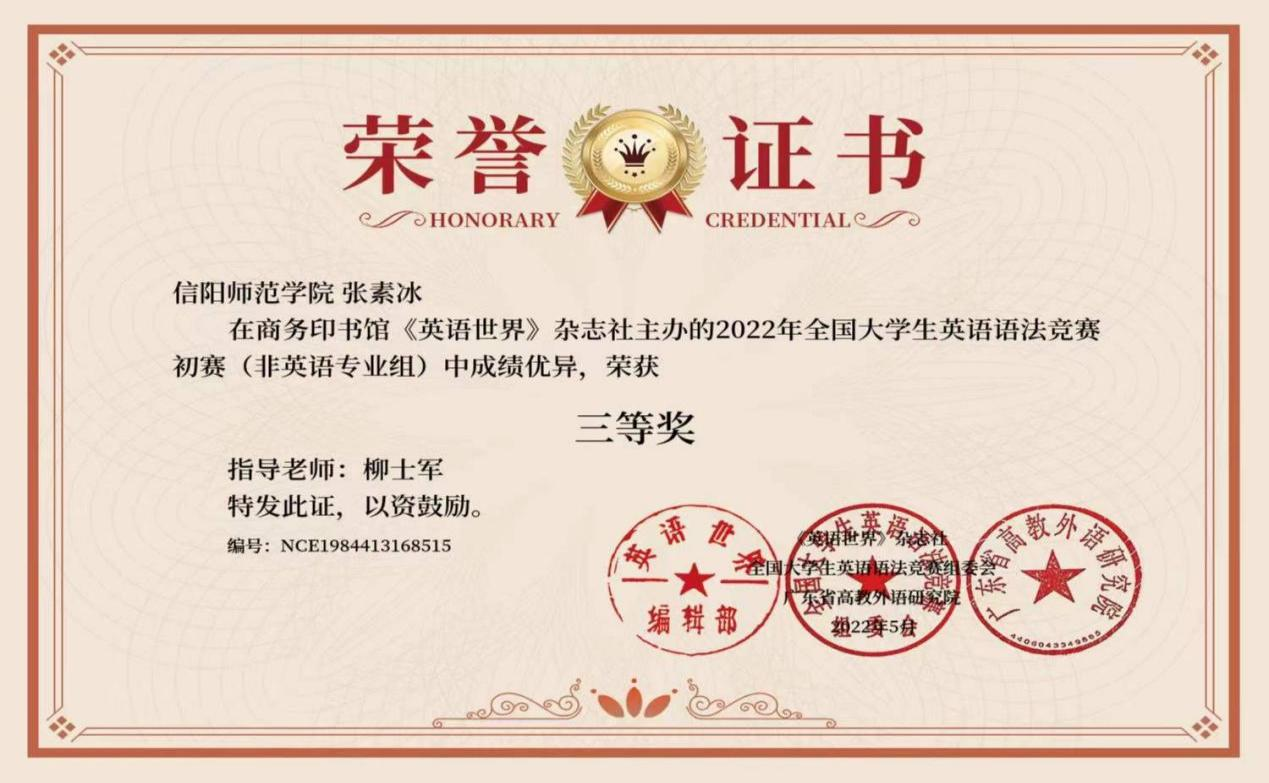 一、2022年全国大学生英语语法竞赛获奖成绩证书如下: