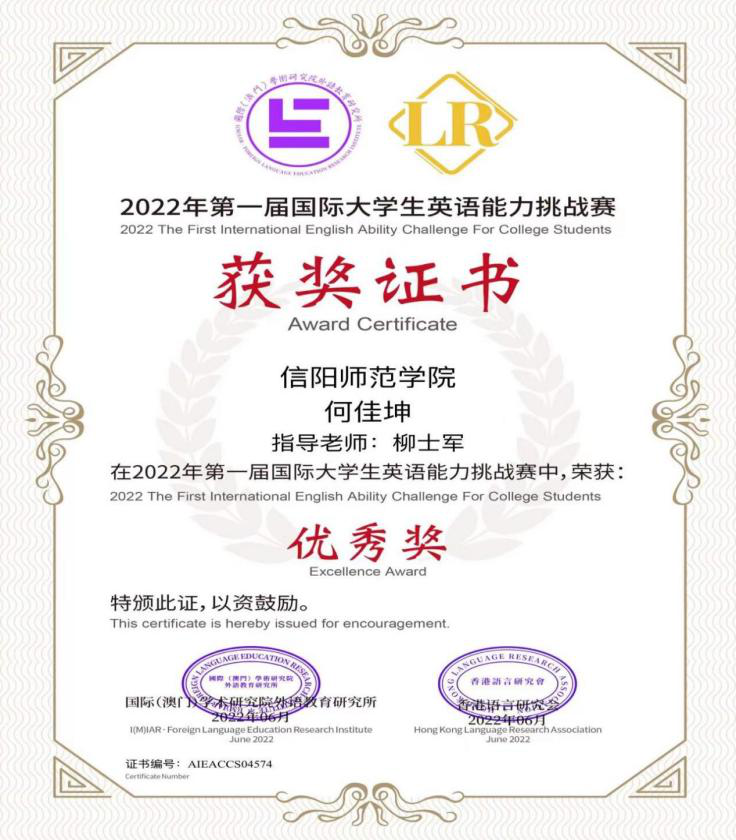 近日,新葡的京集团8814公共外语教研室教师指导学生参加2022年各类英语比赛获佳绩。其中何家坤(指导教师柳士军)获2022年第一届国际大学生英语能力挑战赛优秀奖,李子颖获2022年全国大学生英语作文大赛大学英语组国家级二等奖,洪梦威(指导教师陈丽娟)获2022年全国大学生英语作文大赛大学英语组省级一等奖,王雅萱获2022年全国大学生英语作文大赛大学英语组省级三等奖,曹妍获第二届“外教社·词达人杯”全国大学生英语词汇能力大赛河南赛区本科非英语专业组三等奖,余昌燕获2022年CATTI杯全国翻译大赛初赛大学A组中英(笔译)三等奖,杨菁菁、马灿灿、陈在窑均获2022年第六届普译奖全国大学生翻译比赛英译汉组(初赛)三等奖,李欣茹、马灿灿获2022年全国大学生英语语法竞赛初赛(非英语专业组)三等奖,唐天欣(指导教师柳士军)获2022年创研杯全国大学生英语词汇能力挑战赛全国初赛C类三等奖。