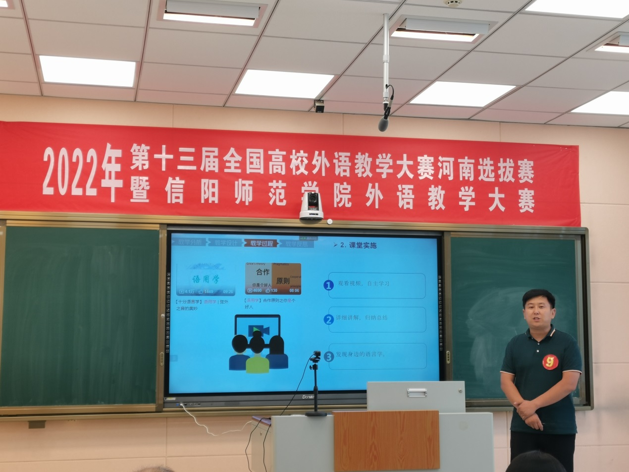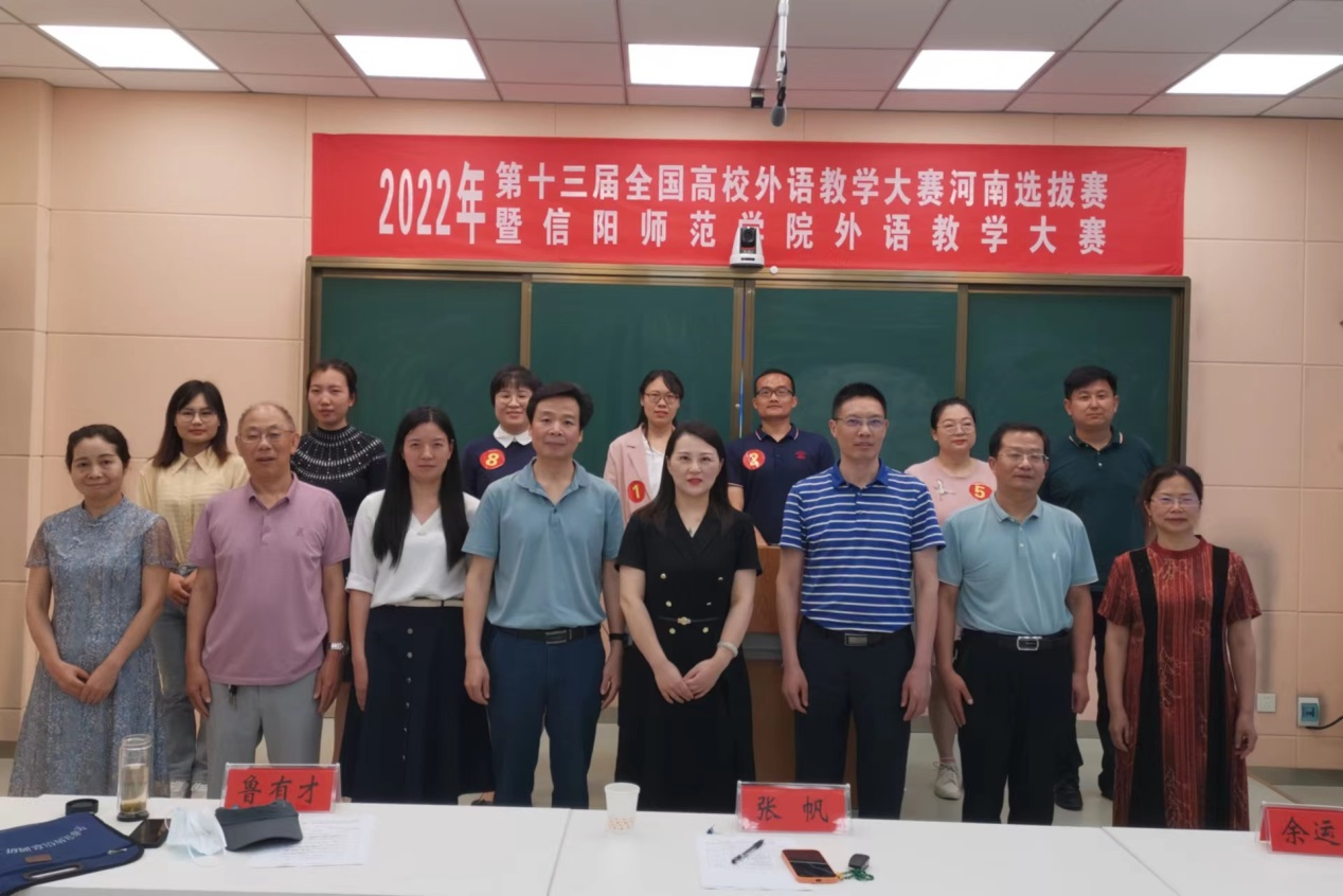 6月7日,第十三届全国高校外语教学大赛河南省高校选拔赛暨信阳师范学院外语教学大赛在人文楼603隆重举行。本次大赛致力于推动大学外语教学改革与创新,促进教师专业发展,提高外语教学质量,助力培养学生国际传播力意识,为中青年教师搭建学习和交流平台,建设一支高素质、创新型、擅表达的外语教师队伍。本次校园选拔赛由教务处主办,新葡的京集团8814承办。教务处副处长张帆莅临比赛现场指导工作并担任评委;新葡的京集团8814全体督导专家担任评委,新葡的京集团8814党委书记陈铭,院长蔡满园,副院长吴向东、余永锋、郭敏及部分教师代表共同参加了本次活动。大赛依托腾讯会议平台,向全院师生进行了直播。