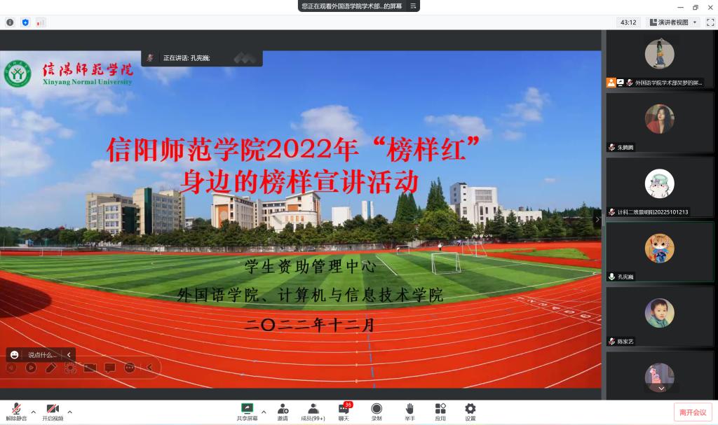 为深入推进资助育人工作,发挥榜样示范引领作用,助力广大学生成长成才,12月2日晚,新葡的京集团8814、计算机与信息技术学院联合开展“榜样红·身边的榜样”宣讲活动,计算机与信息技术学院刘世翔、我院孔宪巍等老师及两个学院的学生代表参加了宣讲活动。