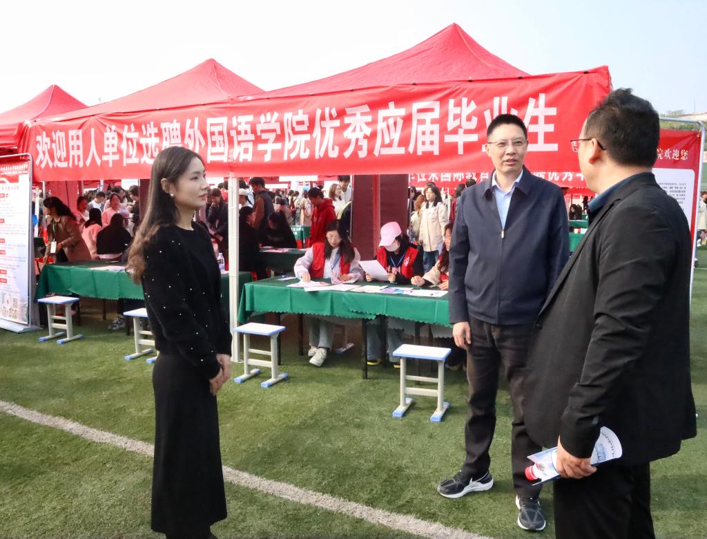 双选会现场气氛热烈,秩序井然。学院设置就业服务台,为招聘单位提供信息咨询、招聘信息登记等对接服务。招聘单位通过海报、宣传单等方式向毕业生介绍单位概况、岗位需求等情况。学院毕业生精神昂扬、信心满满,积极与用人单位沟通交流,询问有关工作内容、职业前景等相关情况。双选会期间,学院党委书记陈铭、副书记高彦伟与招聘单位和毕业生进行深入交流,了解用人单位的招聘需求与就业形势,了解毕业生的就业意向和求职情况,并对他们的求职困惑给予建议和指导。