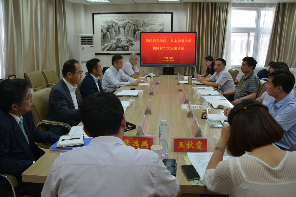 会议伊始,与会人员一同观看了信阳师范学院宣传片。余本海致欢迎辞,他代表学校对古贺郁人一行的到来表示热烈欢迎,简要介绍了我校的发展历史、学科建设、学生国际交流等情况。古贺郁人高度赞扬了我校浓厚的学习氛围,介绍了日本经济大学的办学规模、历史沿革和办学特色。随后,双方围绕签订合作交流协议、交换留学生及双学位项目、科学研究等方面进行磋商。周学红总结讲话,他对日本经济大学的办学理念表示认同,希望双方尽快落实达成的共识,推动校际合作与交流向更高层次迈进。
