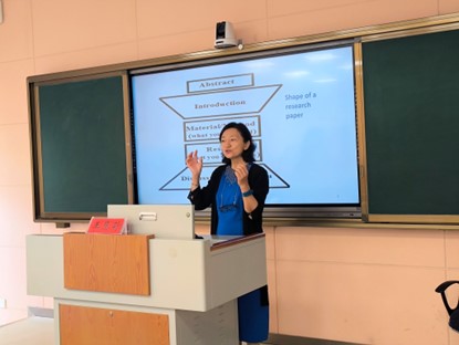 王慧莉教授从理论和实证两个方面介绍了“英语期刊学术论文写作与发表”。在理论层面,主要从Abstract、Introduction、Method、Results、Conclusion等方面具体介绍了学术论文的撰写;在实证方面,王教授基于自身的国外期刊论文发表经历,向在场老师和学生们说明了论文写作中每个部分需要注意的问题以及论文投稿中的注意事项。