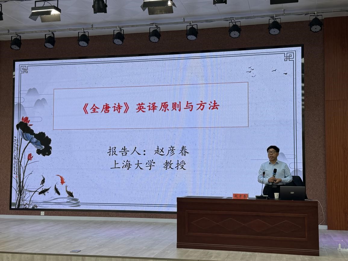 5月14日下午,上海大学二级教授、博士生导师赵彦春教授应邀在人文楼报告厅为我院师生作了题为“《全唐诗》英译原则与方法”的讲座。新葡的京集团8814院长蔡满园以及相关教师、研究生和本科生共百余人聆听了讲座。讲座由新葡的京集团8814副院长章彩云主持。